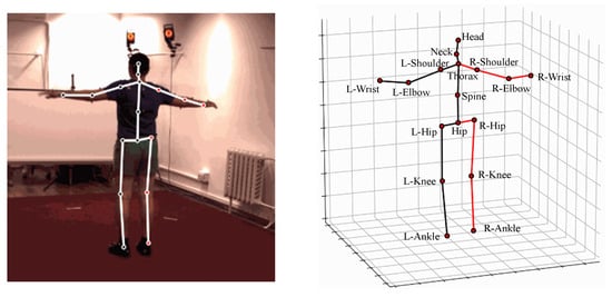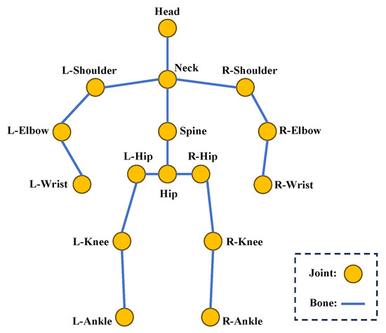 The kinematic model directly abstracts the human body as line segments, with each joint representing a specific body part and connected based on inherent skeletal relationships. The skeletal structure of the human body is displayed in a 3D coordinate system to describe the human posture. Three-dimensional human pose datasets vary in the number of joints they include; for instance, Human3.6M [21] features 17 joints, while HumanEva [22] has 15. The annotations of each joint in the Human3.6M dataset are shown in Figure 2.