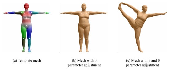 The volumetric model represents the human body using parameterized human body models or triangulated meshes, providing an approximate representation of muscle shapes on the skeletal structure. A widely used parametric representation of the human body is SMPL, a parametrically adjustable human model proposed by the Max Planck Institute for Intelligent Systems in Germany [23], which contains 24 joint points and two sets of controllable input parameters, and , where is the shape adjustment parameter, which consists of a total of 10 parameters responsible for adjusting the height, body size, etc., and the group is the pose adjustment parameter, which contains 75 parameters, respectively, responsible for adjusting the relative angles of the 24 joints in 3D space. When using the SMPL model, the first step is to control the shape of the human body through the parameter, as shown in (a) in Figure 3. The second step is to control the rotation angle of the 24 joints through the parameter, as shown in (b) in Figure 3 to adjust the model into the desired pose.