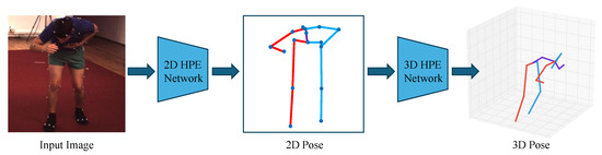 Inspired by the recent achievements in 2D HPE, 2D-to-3D lifting methods have gained popularity as a viable solution for 3D HPE. The 2D-to-3D lifting methods first estimate the positions of 2D keypoints from the input image and then map the 2D keypoints to 3D space, as shown in Figure 5. Zhao et al. [37] utilized intermediate visual representations from pre-trained 2D pose detectors, leveraging the joint-centric spatial context encoded within these representations to significantly enhance the accuracy of 3D pose estimation. In the 2D keypoint detection stage, CNN-based keypoint detectors are commonly used, such as OpenPose [38] and hourglass [39]. In the 3D pose reconstruction stage, optimization methods such as adding geometric constraints to the deep learning model can be utilized to map 2D keypoints to 3D space.