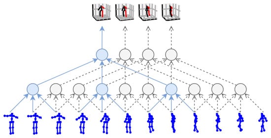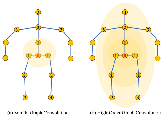 Furthermore, GCNs mainly focus on understanding connections between body joints through first-order neighbors, as shown in Figure 7, overlooking higher-order neighbors, which limits their ability to discern relationships between joint nodes that are further apart. Recent models have focused on building intricate higher-order relationships among joints to represent skeleton information more effectively. Zou et al. [50] aggregated features from nodes at different distances to capture remote relationships between body joints. Quan et al. [51] used multi-hop neighborhoods for node feature aggregation to capture remote dependencies between joints. Li et al. [52] proposed an architecture that integrates multi-layer perceptrons (MLPs) [53] with a GCN through SG-MLP and CG-MLP blocks, effectively capturing both global dependencies and local structural relationships in human poses.