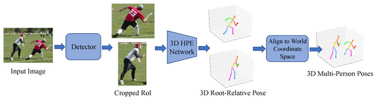 Top-down approaches initially identify individual human areas using a human detection network, then apply a 3D pose network to each detected area to estimate the 3D pose, as shown in Figure 9. Moon et al. [68] proposed a method where cropped human images are analyzed by a root localization network to estimate human root positions relative to the camera. A single-person pose network then estimates the 3D pose for each person.