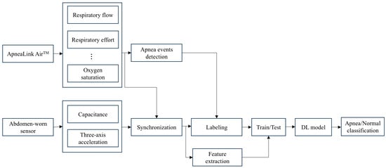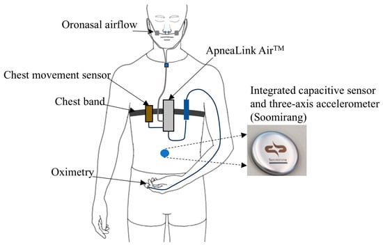 Thirty-seven participants were enrolled for the experiment, and written informed consent was obtained from all subjects. The study received ethical approval from the Institutional Review Board of Ulsan National Institute of Science and Technology (UNIST) under the reference number UNISTIRB-24-006-A. Each subject underwent an overnight measurement with simultaneous sleep monitoring using the ApneaLink AirTM device (Resmed, Bella Vista, NSW, Australia) and the Soomirang device (Figure 2). The ApneaLink AirTM device measured oronasal airflow (sample frequency: 100 Hz), thoracic respiratory effort (10 Hz), pulse, and peripheral oxygen saturation (1 Hz). The Soomirang device (SB Solutions Inc., Ulsan, Republic of Korea) was attached to the belly between the navel and the chest to measure signals of abdominal movement and three-axis acceleration at a sampling rate of 5 Hz. The abdominal movement signal was captured as changes in capacitance, reflecting variations in the distance between the device and the abdominal surface during breathing.