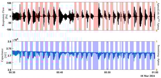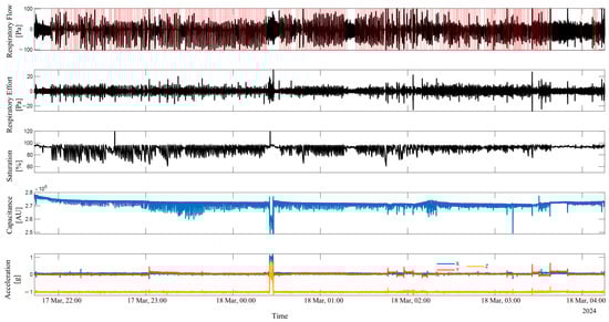 Data recordings from a full-night study of a subject were captured using the ApneaLink Air™ (respiratory flow, respiratory effort, and oxygen saturation) and the Soomirang device (capacitance and three-axis acceleration). The red areas alongside the respiratory flow signal were denoted as annotated apnea events extracted from the ApneaLink Air™.