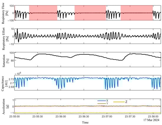 Additionally, the length of the acceleration vector was calculated as the square root of the sum of the squared readings from each axis. Figure 3 shows the data recording and labeling from the ApneaLink AirTM (respiratory flow, respiratory effort, and saturation signals) and the Soomirang device (capacitance and three-axis acceleration) from one subject. The annotated apnea events extracted from the ApneaLink Air™ are highlighted in red areas alongside the respiratory flow signal. Figure 4 presents the data recording of a 100-s time window.