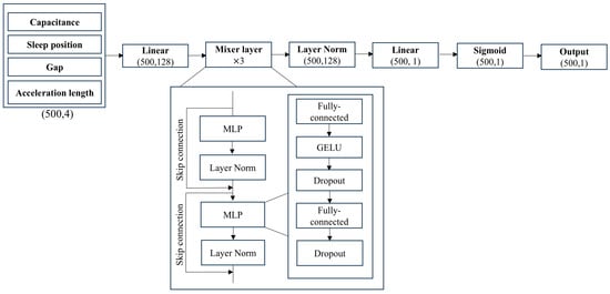 The MLP-Mixer model was introduced by Tolstikin et al. for the image classification task. In this study, the MLP-Mixer model was adapted for the time series data task using the PyTorch (version 2.5.1) library [24]. The MLP-Mixer model takes input from a 100-s time window and processes the data by sliding this window across the entire sleep period, from the start to the end. As a result, the input to the MLP-Mixer model consists of 500 × 4 tables (500 patches, 4 channels). The four channels are four features extracted from the Soomirang data as described in preprocessing, which include normalized capacitance, length of the acceleration, gap, and sleep position. Each table is then transposed, and each row of the table is fed into the same MLP (token mixing). An MLP layer consists of two dense layers, two dropout layers and a Gaussian Error Linear Unit (GELU) nonlinearity [30]. All weights are shared across the same channel for different patches. Subsequently, the table is reversed and transformed back into patches, followed by the same computation being applied to all patches (second MLP layer or channel mixing). Token mixing is implemented using Conv1d with a kernel size of 1, while channel mixing is performed using a linear fully connected layer. Skip connections are used in both the token mixing and channel mixing blocks to prevent gradient vanishing phenomena during training. Sigmoid activation was added before the classification task. The model was trained using a five-fold cross-validation approach with a batch size of 500, a window size of 500, a hidden dimension of 128, and a training iteration of 50,000. The training was performed using the Adam optimizer with a learning rate of 0.001. Details of the hyperparameter tuning process are provided in Appendix A (Table A1). Figure 5 shows the MLP-Mixer model utilized to classify apnea/normal events for time series data. The sigmoid activation function was employed for each layer, and the binary cross-entropy (BCE) loss function was used to calculate the cross-entropy loss. This study aimed to compare the performance of a lightweight model (MLP-Mixer) and a non-lightweight model (BiLSTM). Therefore, both models were configured with a large batch size (500 samples) and a substantial model size for the classification task. The same number of layers, hidden units, optimizer, and loss function were kept for both models to maintain consistency in the evaluation. Further increases in batch size were restricted by GPU resource limitations.