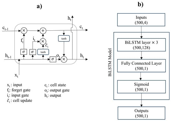BiLSTM layers capture bidirectional long-term dependencies within the time series or sequence data. This approach is suitable for our dataset, where apnea and normal events are characterized by features of time-varying capacitance, length of acceleration, and sleep positions. BiLSTM was observed to have better prediction performance compared with the LSTM model [23,31]. Each BiLSTM layer is composed of two stacked LSTM layers. An individual LSTM cell within these layers consists of three primary gates, namely the input gate, output gate, and forget gate. These gates are optimized during training to regulate the input, output, and memory of cells. The LSTM preserves the output while combining with the new input, effectively maintaining context and handling sequential data dependencies (Figure 6a). Figure 6b shows the BiLSTM architecture used for apnea/normal event detection, comprising three main layers: the input layer, the BiLSTM model, and the output layer. The input layer contains four neurons, corresponding to the four extracted features derived from Soomirang. The BiLSTM model comprises three BiLSTM layers followed by a fully connected linear layer. To generate class probabilities, the network’s output is normalized using the sigmoid function. The model was trained using a five-fold cross-validation approach with a batch size of 500, a window size of 500, and a hidden dimension of 128. The training was performed using the Adam optimizer with a learning rate of 0.001. The sigmoid activation function was employed in each BiLSTM layer, and the BCE loss function was used to calculate the cross-entropy loss.