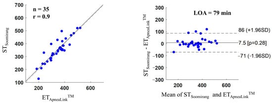 Figure 7 shows the Pearson correlations and Bland–Alterman plots in a comparison between the estimated ST extracted from Soomirang (STSoomirang) and the evaluation time extracted from ApneaLink AirTM (ETApneaLinkTM). The correlation coefficient (r) was 0.9 and the limit of agreement (LOA) at 95% confidence (1.96 SD) ranged from −71 to 86 min (mean difference of 79 min). The average time difference between the two devices was 7.5 min.