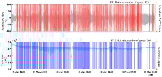 Example of apnea events detected by the Soomirang device compared with those detected by ApneaLink Air™ in an entire recording. Red and blue bars represent apnea events detected by ApneaLink AirTM and Soomirang, respectively.