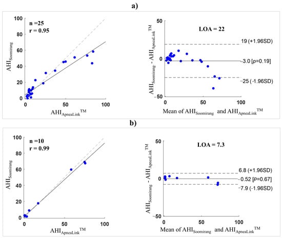 Pearson correlation and Bland–Altman plots for a comparison between the AHI calculated by Soomirang and ApneaLink AirTM devices: (a) in a five-fold validation and (b) in the test set. The dotted line in the Pearson correlation plot represents the line of equality, the dotted lines in the Bland-Altman plot indicate the range within which 95% of the differences are expected to fall. The character n is the number of subjects, r is the correlation coefficient, LOA is the limit of agreement, and SD is the standard deviation.