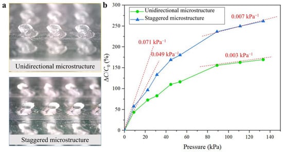 Experimental comparison of the sensors with different microstructures. (a) The microscope images of two microstructures. (b) The sensor with the staggered tilted column design exhibits a significantly higher sensitivity compared to the unidirectional sensor.