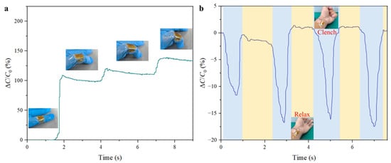 The exceptional sensitivity and rapid response time of such a flexible pressure sensor make it an ideal candidate for advanced gesture recognition systems. To demonstrate its capabilities, two prototypes are developed that showcase how the sensor can be effectively used in real-time gesture detection. As shown in Figure 5a, the sensor is fixed on the knuckle of the hand to detect and identify finger bending movements. The staggered microstructure design enables the sensor to detect the changes in stress as the fingers bend and also facilitates precise differentiation among varying degrees of finger flexion, thereby providing a high-resolution output that accurately captures each gesture. This characteristic could be further applied in wearable devices aimed for use in human–computer interaction, where precise finger movements need to be translated into commands or inputs. The sensor could also be applied to the wrist to detect the clenching and unclenching of a fist as well. However, the complex biomechanics of the wrist, involving multiple tendons and muscles, present a challenge for accurate pressure sensing. As depicted in Figure 5b, the sensor’s enhanced sensitivity ensures that it can reliably monitor the variations in pressure across the wrist as the fist transitions between an open and closed state. This enables the sensor to differentiate between subtle variations in the intensity of the clenching motion, thus offering nuanced data that could be used in gesture-based control systems. Such an application could be extended to various fields, including gaming, robotics, and wearable health monitoring devices, where the precise detection of hand movements is critical.