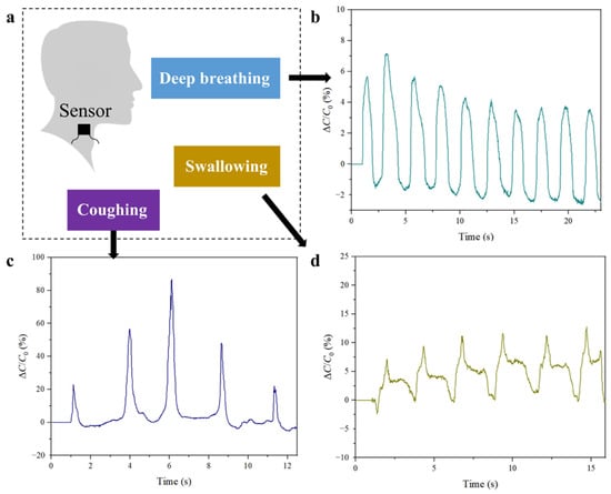 Physiological monitoring applications of the sensor. (a) The sensor is applied to the neck, where activities such as deep breathing, coughing, and swallowing generate distinct pressure patterns. (b) The sensor was able to capture the rhythmic pressure changes associated with deep breathing. (c) The sensor was able to detect the sharp pressure spikes characteristic of coughing, with larger capacitance variations compared to deep breathing. (d) The sensor could effectively monitor swallowing activity, with a longer duration of capacitance variation and a characteristic initial spike followed by a more gradual change, thereby mirroring the swallowing process.