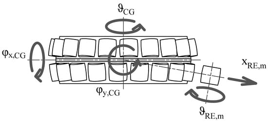 Figure 2. Schematic representation of the DOFs of the inner ring. - Each RE is positioned in a specific slot in the cage by rotating on the z axis, tilting on the y axis, and translating the cage RF by , , and , respectively, where m is used to represent the mth RE, as M is the number of REs per row. The operations are executed with an axis rotation, a quaternion rotation, and a cylindrical transform.The rotation’s formulation is as follows:where are the base DOFs. As in Equation (2), is a zeroes matrix and is the following rotation matrix:where the subscript indicates the mth slot in the cage.Tilting by is applied as a quaternion rotation. The elements in the vector are translated into the complex space to create quaternions with the following arrangement:where are basis unit vectors in the complex space. The two DOFs are then subjected to the following quaternion rotation:where q is the quaternion and is its complex conjugate, defined as follows:where are the components of the unit vector indicating the direction parallel to the tilt rotation, which in our case isFinally, the vector is recomposed and translated to the correct radial position:where isThis leaves us with an RF defined aswhich we couple with a pin slot joint to the mth RE’s degrees of freedom:which leaves the translation perpendicular to the cage slot and the rotation both free, as is reproduced in Figure 3. The perpendicular translation, which at time 0 is , changes during simulation due to rolling of the RE, meaning that the actual coupling condition is as shown below.
