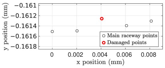 Localized faults were modeled independently on the inner and on the outer races. Damage can be activated when desired, and is represented by moving a series of points in the central circumference of the point cloud. We modeled damage in the positive normal direction to the surface, as this ensures that the fault is actually significant [51]. The fault can be represented by either modifying the radial position of a number of existing points or by adding new ones; as an example, Figure 5 shows a single point damage example with a 0.2 mm positive offset fault on the outer ring.