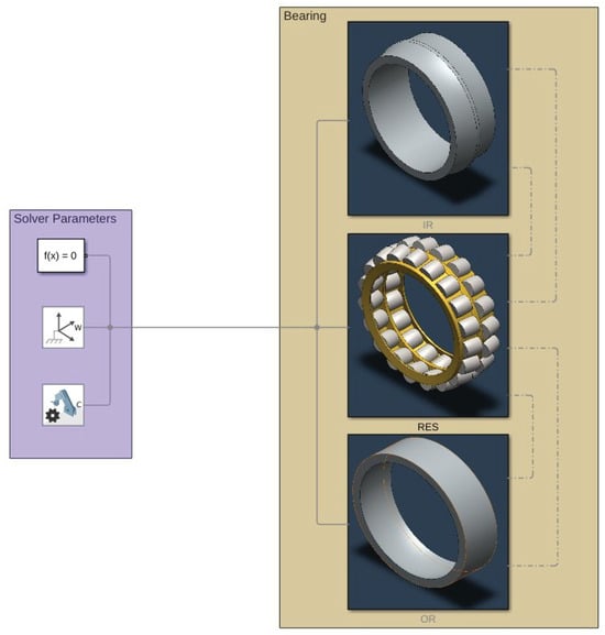 In order to investigate the dynamic behavior of spherical roller bearings and evaluate the impact of localized defects, a multibody simulation model was developed in Simulink® Simscape Multibody. This model depicts the relationships among the Inner Race (IR), Outer Race (OR), Rolling Elements (RE), and cage, with the integration of essential geometric features shown in Figure 1 and outlined in Table 1.