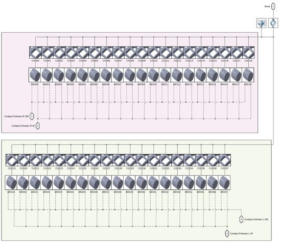 The model was implemented in Simulink® using the Simscape Multibody library (version 2023, Mathworks®). As this software does not explicitly disclose the underlying multibody formulation, a Lagrangian-based approach (Equation (1)) is assumed. This formulation is commonly used for flexible and constrained systems. Here, represents the mass matrix, is the Jacobian of the constraints, denotes Lagrangian multipliers, Q denotes the generalized forces acting on the system, and represents the accelerations of the generalized coordinates.