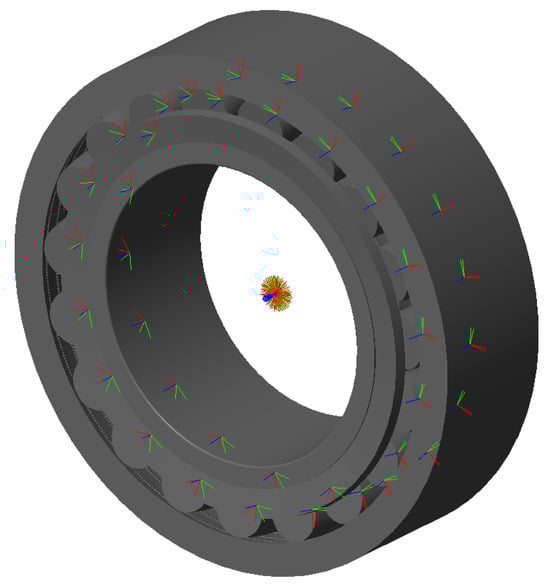 The bearing model contains 41 total bodies, including 38 REs along with the inner ring, outer ring, and cage. Each element has its original RF in the center of revolution, with the z axis used as the revolution axis. The axis defines the plane of symmetry corresponding to the raceways of both the IR and OR, while in the REs it is the symmetry plane parallel to the non-contacting faces.