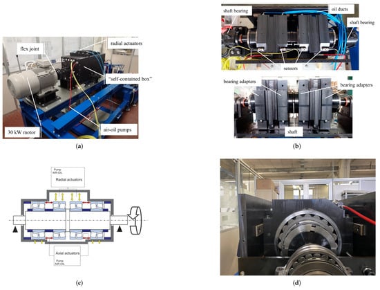 Test rig used for condition monitoring of medium-sized bearings: (a) self-contained box [48]; (b) shaft, adapters, and sensors [48]; (c) load path [48]; (d) bearing SKF® 22240 CCK/W33.