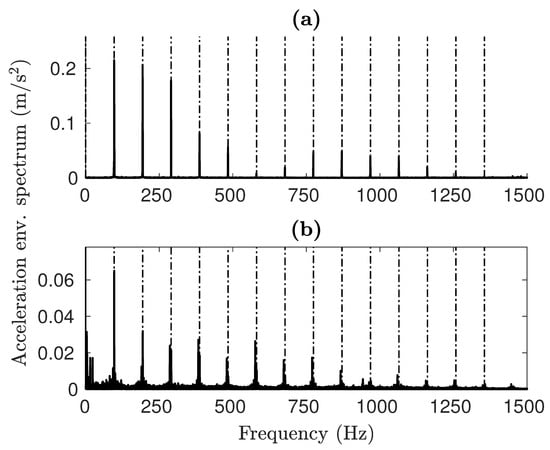 Signals from undamaged bearings (Figure 11a,b) do not reveal apparent signs of fault excitation. The maximum values from the simulation are slightly lower than those from the damaged model, but are still coherent in terms of magnitude. Both of these conditions help to affirm the coherence of the model.
