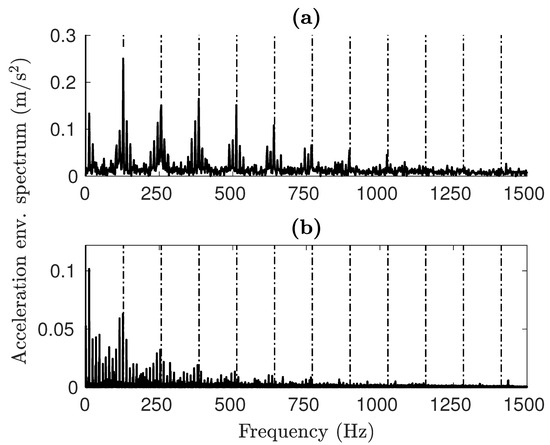 OR fault envelope spectra for (a) simulated and (b) experimental signals.