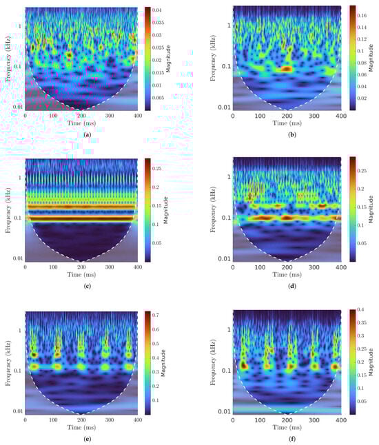 The analyses conducted in this study each focus on a specific load condition, allowing the proposed methodology to be validated using a restricted subset of the dataset while excluding the effects of axial loads. Specifically, we maintain a fixed radial load of 124.8 kN, facilitating our examination of fault patterns at varying speeds while mitigating confounding effects arising from the interplay between load and speed variability. To investigate vibrational signals within the time–frequency domain, the Continuous Wavelet Transform (CWT) was employed [2,52].
