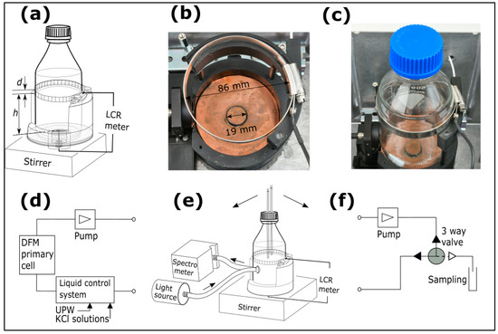 Electrode configuration for non-contact impedance spectroscopy (NCIS) on a 500 mL lab-bottle and measurement system: (a) schematics of lab-bottle with a closed lid in a bottle mount, (b) a photograph of the electrodes with scale bars, (c) a photograph of the electrodes attached to a lab-bottle, (e) lab-bottle in the bottle mount, inserted in a flow-loop ((d) or (f)) and with optical reflection spectroscopy from the vicinity of the inner bottle wall. Measurements in the flow-loop are made for the two types of sample series: (d) ultra-pure water and KCl solutions and (f) BHI-media comprising bacteria, where samples are collected for on-line and off-line analyses.