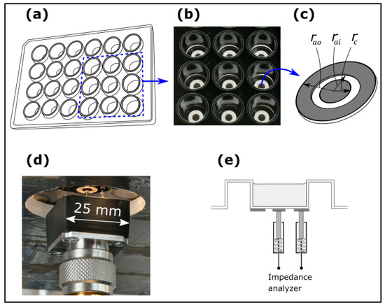 Figure 2 illustrates an electrode configuration for NCIS on a well in a 24-well plate (cell imaging plate from Eppendorf, Hamburg, Germany) with (Figure 2a) a schematic of the well plate, (Figure 2b) a photograph of a selection of 3 × 3 series of electrodes from the top of the 24-well plate, (Figure 2c) definitions of the electrode dimensions, (Figure 2d) a photograph of the electrodes from below with a scale bar and (Figure 2e) a cross-sectional schematic of the electrodes. Screen-printed annular electrodes of gold on a polymer film with a pressure sensitive adhesive from the Danish Technological Institute (inner radius of disc, = 2 mm, inner radius of ring, = 4 mm, and outer radius of ring, = 7 mm; see Figure 2b) are attached to the backside glass plate of the 24-well plate. A pair of spring-loaded pins (RS-PRO Rounded 2-part Spring probe with a length of 25 mm, a diameter of ø1.36 mm) ensures electrical contact to the annual electrodes. The pins are attached to an N-connector mounted in a test station and connected to a Keysight 4291B Impedance Analyser (Keysight Technologies, Santa Rosa, CA, USA) recording impedance data from 1 MHz to 600 MHz with a voltage amplitude of 1 V. An aluminium lid with attached heater elements for temperature control covers the 24-well plate and shields for electr omagnetic interference. Inside the lid, a calibrated Pt100 sensor (AccuMac Technology, Gilbert, AZ, USA) measured by a Fluke 1529 thermometer (Fluke Corporation, Everett, WA, USA) readout monitors the temperature. The measurements are made with temperature control inside an air-bath [26] with a setpoint just below the target temperature and with separate heaters ensuring temperature stabilization at the target temperature. The data from all instruments are acquired using a software code written in a combination of National Instruments LabWindows/CVI, version 20.0.0 and Visual Studio C++, 2022, version 17.13.5.