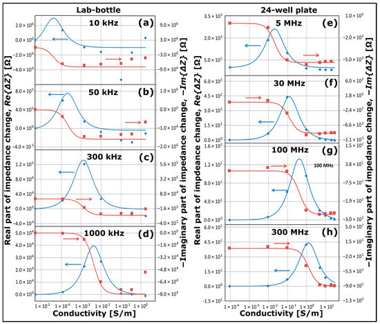 The effects of the insulating glass walls of the lab-bottle or the insulating glass plate of the 24-well plate are eliminated by plotting the impedance data in Figure 3 as changes, subtracting from the impedance data the values for UPW/pure water acting as a baseline solution. It should be noted that in Figure 3 and all subsequent plots comprising impedance data, the plots are presented as impedance changes, and depending on the baseline, the data can be negative or positive. In Figure 3, data of real parts of the impedance change are plotted as blue diamond symbols, and data of imaginary parts of the impedance change are plotted as reddish-brown square symbols. A possible drift in pure water caused by the ambient conditions has a negligible or minor effect on the data set, since the conductivities of the other solutions are at least two orders of magnitude larger than the conductivity of pure water.
