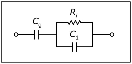 The blue solid curves and reddish-brown curves in Figure 3 are plots of computations based on an expression as derived in the following from the equivalent circuit diagram in Figure 4. Since the capacitance () related to the insulating glass wall or glass plate is a constant, it is eliminated in the computation of changes in the impedance. In this case, the equivalent circuit diagram is reduced to the simplest possible diagram for an electrolytic conductivity cell being a parallel RC-circuit [32], and the real part of the impedance change can be written as follows: