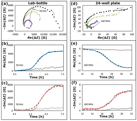 NCIS data are plotted in Figure 5 for growth of S. epidermidis using two different measurement configurations: (Figure 5a–c) for a lab-bottle recorded by the Keysight E4980 LCR meter at 50 kHz (configuration in Figure 1d) from a time, 4.5 h to 7.5 h after inoculation of the bacterial culture; and (Figure 5d–f) for a well in a 24-well plate recorded by the Keysight 4291B Impedance Analyser at 160 MHz (configuration in Figure 2) from 12 h to 22 h after inoculation of the bacterial culture. NCIS data recorded at (Figure 5a–c) 4.5 h and (Figure 5d–f) 12 h, respectively, are subtracted from the data in each plot as baselines. In Figure 5a, is plotted as a function of at t = 6.0 h (violet square symbols), t = 7.0 h (green triangular symbols) and t = 7.5 h (black circular symbols), and in Figure 5d at t = 15.5 h (violet square symbols), 17.5 h (green triangular symbols) and t = 22 h (black circular symbols), where the rightmost arrows indicate the direction of the impedance data for increasing frequency. These plots are of a type commonly referred to as “Nyquist diagrams” [1]. The blue symbols in Figure 5b,e are plots of as a function of , and the reddish-brown symbols in Figure 5c,f are plots of as a function of . The average and standard deviation of temperature during the bacterial growth is (37.026 ± 0.011) °C for the data in Figure 5a–c and (37.002 ± 0.004) °C for the data in Figure 5d–f. With a temperature coefficient of 2%/°C, temperature effects on the data are small and can be neglected. Furthermore, the overall stability of the system was tested with continuous real-time measurements of pure BHI media, shown in grey dotted plots in Figure 5b,c,e,f, demonstrating stability and robustness over the entire course of the experiments done on different days. The plots show minimal to no effect on measurements.