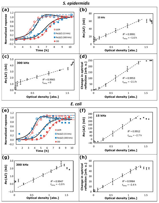 Bacterial growth data for (a–d) S. epidermidis and (e–h) E. coli with (a,e) normalized response during bacterial growth as a function of time for change in optical reflection (∆OR) (open circular reddish-brown symbols), the real part of the impedance change () at 15 kHz (open square blue symbols) and at 300 kHz (filled square blue symbols), and optical density (OD) (filled circular reddish-brown symbols); and corresponding plotted as a function of OD for (b,f) 15 kHz and (c,g) 300 kHz; and (d,h) ∆OR plotted as a function of OD. The dashed lines in (b–d) and (f–h) are linear regression lines within the OD range from 0.16 to 1.3. The dashed curves in (a,e) are data fitting using Equation (7). The leftmost and rightmost solid black curves in (a,e) are computations based on Equation (11) for 15 kHz and 300 kHz, respectively (see text).