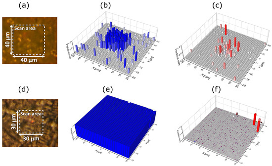 For the present measurements, samples of BHI-medium containing bacteria were collected by the end of the growth phase. The samples were dried, positioned on a CaF2 microscope slide and analysed by Raman microscopy assisted by machine learning for identification. The prediction maps, as shown in Figure 8, consist of hyperspectral Raman maps with a size of 40 μm × 40 μm for Figure 8a and 30 µm × 30 μm for Figure 8d, and they consist of 1678 and 944 Raman spectra, respectively, in the range from 700 cm−1 to 1600 cm−1 with 1 μm spacing between the points. The Raman spectra are acquired with five-times averaging and with 3 s integration, and the results from a sample are presented in Figure 8 with (a) and (d) optical images of the scan area, (b) and (e) bacterial species identification with S. epidermidis and E. coli species, respectively mapped out, and (c) and (f) prediction maps for the rest of the 16 bacterial classes. The overall density surface coverage is 8.0% for S. epidermidis, 2.1% for the rest of the bacterial species identification comprising 16 different classes of bacteria, and 89.9% for the CaF2 background. Specifically, the model classifies 1551 Raman traces (points) as CaF2 background, 118 points as S. epidermidis, five points as Acinetobacter, four points as Corynebacterium afermentans and three points as S. aureus. Thus, it is observed that mainly S. epidermidis species are identified, which verifies that the data as plotted in Figure 6 originate from growth of S. epidermidis. Similarly, the overall density surface coverage of E. coli is 99%, showing a crowded surface almost completely occupied by E. coli, 0.5% S. epidermidis and the remainder comprising 16 other species, confirming that the species used in the NCIS measurements were not contaminated.
