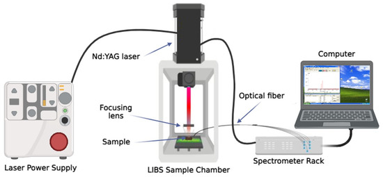 A schematic diagram of our LIBS system is shown in Figure 1. A LIBS 2000+ (Ocean Optics, Inc., Dunedin, FL, USA) was employed for this study. The system comprises a Nd:YAG laser (1064 nm, 8 ns, up to 250 mJ/pulse), seven concatenated high-resolution Czerny-Turner fiber optic spectrometers (Ocean Optics Inc, Dunedin, FL, USA, HR2000, 0.1 nm resolution), and a digital signal delay generator. Samples were mounted on a 2D, flat, displaceable platform, allowing precise selection of the laser impact point. A mobile convex lens with a focal length of 50 mm was used to focus the beam on the sample surface [16,17,18,19].
