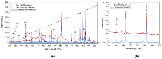 (a) Measured and spectral treatment LIBS all-range spectra from raw cocoa pellets (214.72 ppm concentration); (b) the cadmium interest spectral section used in this work. The red spectra have a strong background component due to electron reverse bremsstrahlung radiation. This component is efficiently removed with our algorithm.