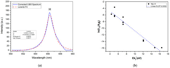 (a) The 656.3 nm hydrogen line is shown together with the corresponding curve fitting with nm; (b) the Saha–Boltzmann plot constructed using integrated Mg I and II atomic and ionic lines. The horizontal axis represents the excitation energy of the upper levels of the observed transitions (eV), while the vertical axis represents the logarithm of the intensity ratio. The plasma temperature is determined from the slope of the linear fit, which accounts for these intensities and their corresponding energy level gaps [20].