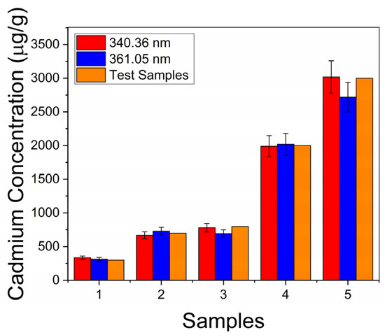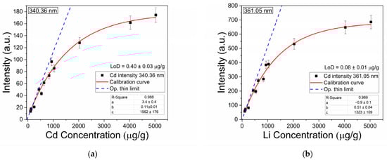 The Cd concentration calibration curve was constructed from 340.36 nm and 361.05 nm intensities of the cocoa samples acquired plotted against concentration, as depicted in Figure 4. Each data point represents the average of 50 measurements taken on each sample. Here, the error bars correspond to the relative standard deviation, ranging between 2% and 10%, which is consistent with values in the literature [34,36].
