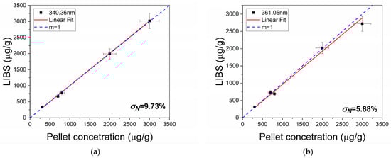 To assess the accuracy of our LIBS results, the averaged quantification error between the concentration of (unknown) test samples and the concentration obtained by the calibration curve, as shown in Figure 6, was evaluated using a normalized standard deviation.
