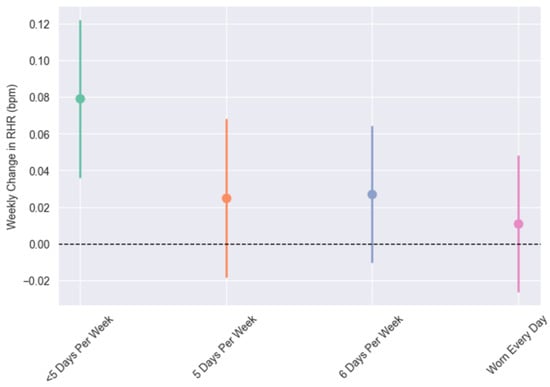 Weekly changes in resting heart rate (RHR) from categorical models across wear groups: “<5 days per week” was defined as weekly wear average of <5 days across 12-week study period, “5 days per week” was defined as 5.0–5.99, “6 days per week” as 6.0–6.99, and “Worn Every Day” as 7 days of wear each week, with one-day exception in first week to account for activation technicalities. All groups were significantly lower than <5 days per week (Ps ≤ 0.013).