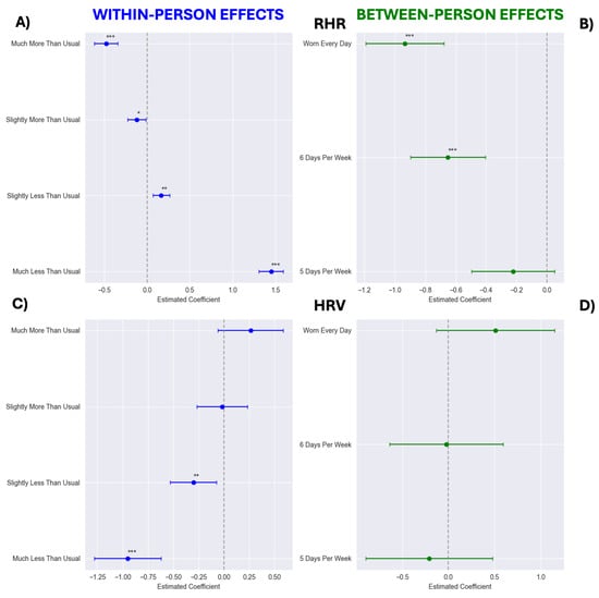Between- (panels (B,D)) and within-person (panels (A,C)) effect estimates from categorical models of wearing WHOOP on resting heart rate (RHR; panels (A,B)) and heart rate variability (HRV; panels (C,D)). Within-person reference categories modeled as follows: “Typical Wear”, wear frequency within ±0.1 of typical (−0.1 ≤ deviation ≤ 0.1); “Much Less Than Usual”, wear frequency 2 days fewer than typical (≤−2.0 days); “Slightly Less Than Usual”, wear frequency between 2.0 and 0.1 days fewer than typical (−2.0 < deviation < −0.1 days); “Slightly More Than Usual”, wear frequency between 0.101 and 1.0 days more than typical (0.101 ≤ deviation ≤ 1.0 days); “Much More Than Usual”, wear frequency 1.0 days more than typical (>1.0 days). For between-person models, <5 days per week served as reference. Wear time of “5 days per week” was defined as 5.0–5.99, “6 days per week” as 6.0–6.99, and “Worn Every Day” as 7 days of wear each week, with one-day exception in first week to account for activation technicalities. * p < 0.05, ** p < 0.01, and *** p < 0.001.