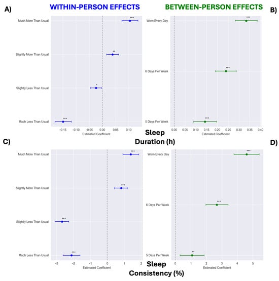 Between- (panels (B,D)) and within-person (panels (A,C)) effect estimates from categorical models of wearing WHOOP on sleep duration (panels (A,B)) and sleep consistency (panels (C,D)). Within-person reference categories modeled as follows: “Typical Wear”, wear frequency within ±0.1 of typical (−0.1 ≤ deviation ≤ 0.1); “Much Less Than Usual”, wear frequency 2 days fewer than typical (≤−2.0 days); “Slightly Less Than Usual”, wear frequency between 2.0 and 0.1 days fewer than typical (−2.0 < deviation < −0.1 days); “Slightly More Than Usual”, wear frequency between 0.101 and 1.0 days more than typical (0.101 ≤ deviation ≤ 1.0 days); “Much More Than Usual”, wear frequency 1.0 days more than typical (>1.0 days). For between-person models, <5 days per week served as reference. Wear time of “5 days per week” was defined as 5.0–5.99, “6 days per week” as 6.0–6.99, and “Worn Every Day” as 7 days of wear each week, with one-day exception in first week to account for activation technicalities. * p < 0.05, ** p < 0.01, and *** p < 0.001.