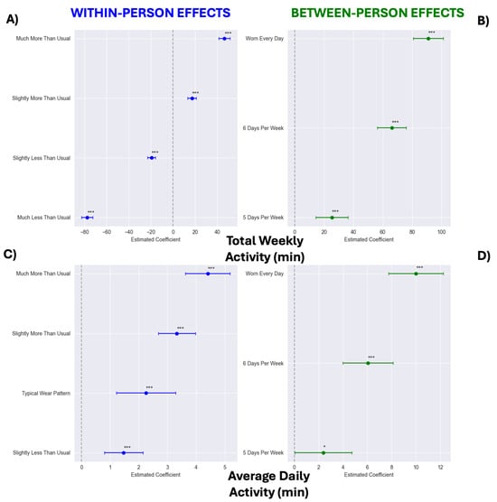 Between- (panels (B,D)) and within-person (panels (A,C)) effect estimates from categorical models of wearing WHOOP on total weekly activity minutes (panels (A,B)) and daily activity minutes (panels (C,D)). Within-person reference categories modeled as follows: “Typical Wear”, wear frequency within ±0.1 of typical (−0.1 ≤ deviation ≤ 0.1); “Much Less Than Usual”, wear frequency 2 days fewer than typical (≤−2.0 days); “Slightly Less Than Usual”, wear frequency between 2.0 and 0.1 days fewer than typical (−2.0 < deviation < −0.1 days); “Slightly More Than Usual”, wear frequency between 0.101 and 1.0 days more than typical (0.101 ≤ deviation ≤ 1.0 days); “Much More Than Usual”, wear frequency 1.0 days more than typical (>1.0 days). For between-person models, <5 days per week served as reference. Wear time of “5 days per week” was defined as 5.0–5.99, “6 days per week” as 6.0–6.99, and “Worn Every Day” as 7 days of wear each week, with one-day exception in first week to account for activation technicalities. * p < 0.05 and *** p < 0.001.