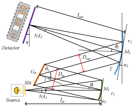 The conventional spectrometer design frequently necessitates a certain level of design expertise. In summary, the design procedure involves initially estimating the grating line density based on the effective operating bandwidth and resolution requirements. To achieve high diffraction efficiency, the grating’s incidence angle should be minimized to approximate the auto-collimating incidence angle. The selection of the curvature radii for the collimating and focusing mirrors adheres to the basic imaging equation, while the deflection angle is determined using the coma-free equation as illustrated in Equation (24) [