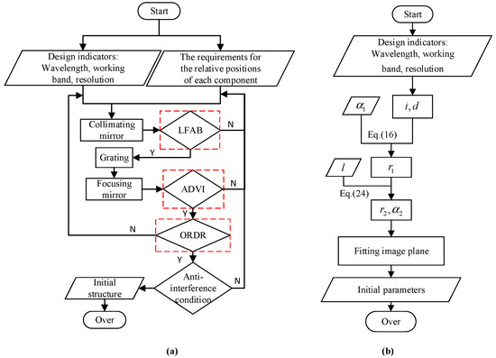 Section 3, building upon the preceding research, the anti-interference conditions within the method of initial engineering structure (MEIS) are integrated while ensuring the fulfillment of optical specifications, thereby obtaining a spectrometer structure that better aligns with practical application standards. A broadband, high-resolution spectrometer system is designed, featuring a wavelength range from 500 to 750 nm and a resolution of 0.4 nm, with a flowchart summarizing the design process.