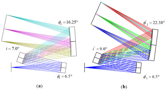 Figure 3b depicts the traditional MOIS centered around the coma-free equation. Simulation results confirm that the vertical distance between the collimating mirror and the focusing mirror in the MOIS is less than 2 mm, with an overall size of 78 mm × 77 mm × 25 mm. Meanwhile, in order to further compare the relative position changes of each component, we marked the working angles of the optical components in