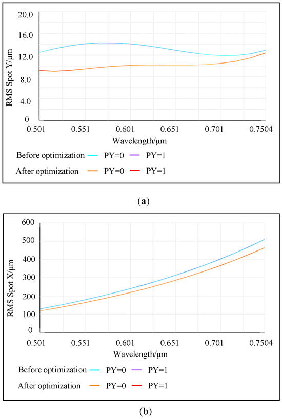 Figure 5b represents the RMS curve diagram of the sagittal plane before and after optimization, respectively. When PY = 0, it indicates a zero field of view, and when PY = 1, it represents a full field of view. The blue and orange curves illustrate the changes in the RMS values before and after optimization for the zero field-of-view scenario. Meanwhile, the purple and red curves show the changes in the RMS values before and after optimization for the full field-of-view scenario. It is not difficult to find through