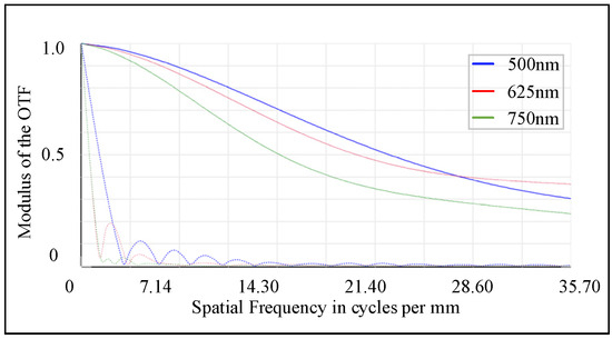 Figure 6 shows the MTF curves at the Nyquist frequency, where different colors correspond to different wavelengths. It can be observed that the MTF values of each wavelength are generally high in the low and medium-frequency regions, while they decline relatively gently in the high-frequency region. Moreover, at the Nyquist frequency, the MTF values of all wavelengths are higher than 0.2, which is consistent with the frequency response characteristics of the detector. At the same time, the curves show continuity throughout the frequency range, and there is no sudden cut-off at certain frequencies. This feature further proves the good quality of the imaging system.