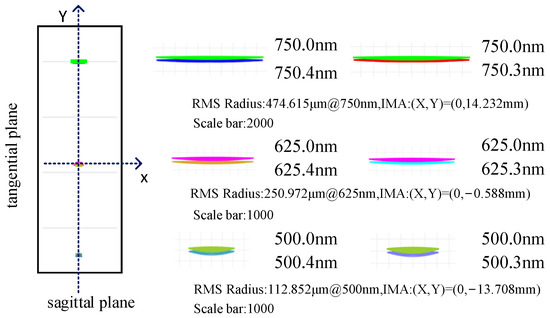 Figure 8 illustrates the separation of image points when the intervals between two adjacent wavelengths are 0.4 nm and 0.3 nm, respectively, within the working wavelength band. Each color corresponds to a different wavelength. In