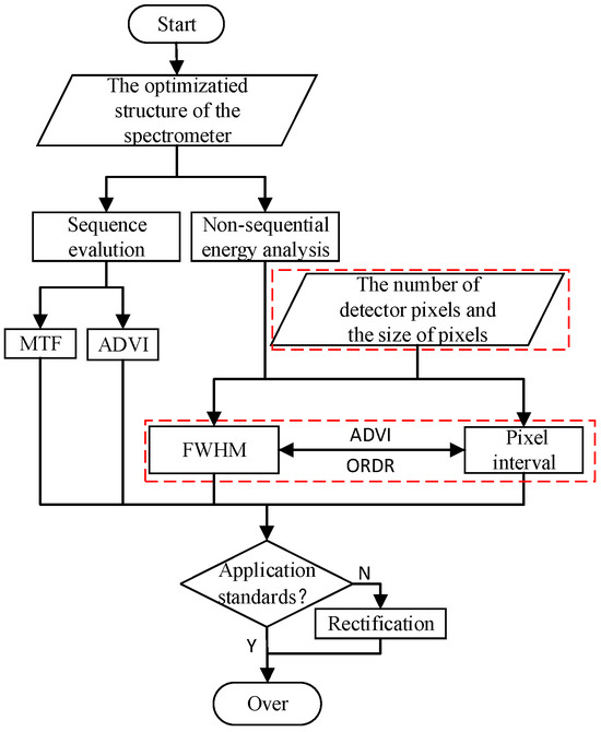 26]. This article acknowledges the contributions of the MOIS in the design process of the C-T type spectrometer. At the same time, it is not difficult to find that in recent years, many researchers have also been focusing on the elimination of aberrations and related spectrometer design research. In order to further improve the completeness of the theoretical research on the spectrometer system, the following tasks have been undertaken. Firstly, three significant theoretical criteria have been established. Different from the previous research, we focus on solely pursuing the complete elimination of a single aberration. The spectrometer system is now defined using the F-number through the imaging relationship, thereby establishing the luminous flux and aberration balance criterion (LFAB). This approach allows for the selection of the numerical aperture at the slit to ensure adequate luminous flux while effectively controlling overall aberration. The Airy disk variation criterion at the imaging point (ADVI) for each wavelength is aimed at assessing the aberration variation across different wavelengths and fields of view, thereby providing a reference for the optimization process. Regarding the uneven distribution of imaging points for each wavelength on the image plane, a matching criterion between optical resolution and detector resolution (ORDR) has been derived. This criterion not only validates the rationality of the initial structural parameters but also provides a valuable reference for subsequent optimization efforts. Secondly, during the evaluation process of the spectrometer system, a non-sequential evaluation method has been incorporated. By elucidating the limitations of the spot diagram as the primary sequential evaluation metric, the significance of determining the actual spectral FWHM is highlighted. This involves considering the real luminous flux, slit size, and discrete sampling of the detector, while accounting for the effects of diffraction, to ensure enhanced accuracy in the system’s practical applications. The aforementioned research holds significant practical value, and it is noteworthy that no comparable systematic studies have been reported to date.