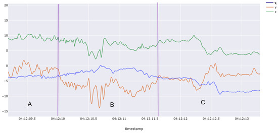 Example smartwatch accelerometer data for the buprenorphine gesture. This figure illustrates accelerometer data collected during a simulated buprenorphine-taking gesture. The motion pattern highlights distinct sub-actions: (A) tearing open the top of the packet and bringing the medication toward the mouth; (B) placing the sublingual film under the tongue; and (C) lowering the hand back down.