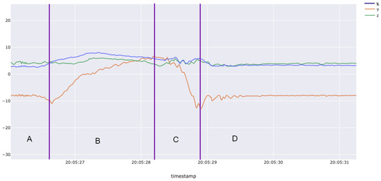 Example smartwatch accelerometer data for the methadone gesture. This figure presents accelerometer recordings from a smartwatch worn during a simulated methadone-taking gesture. The motion trajectory illustrates key phases of the action: (A) unscrewing the cap (not visible in accelerometer data, as the hand without the watch performed this action); (B) raising the bottle to the mouth and ingesting the liquid; (C) lowering the bottle back down; and (D) the completion of the gesture.